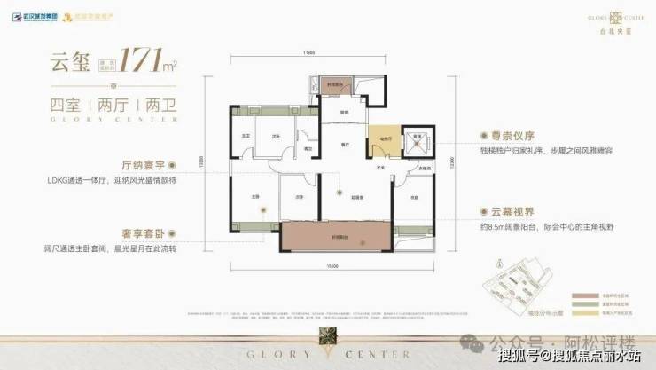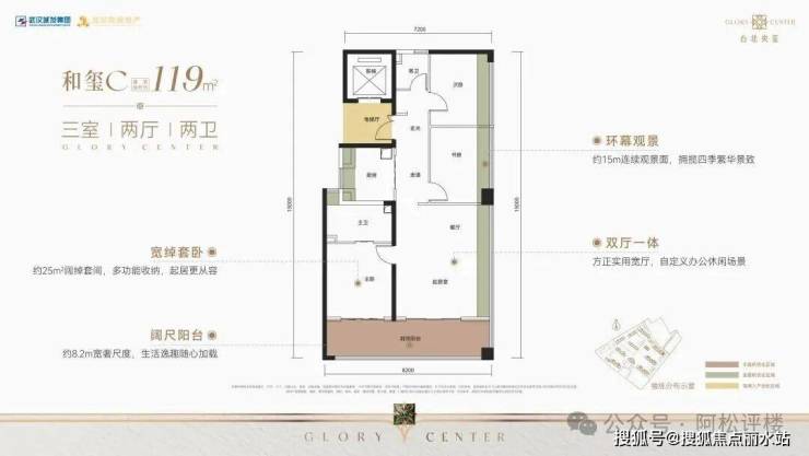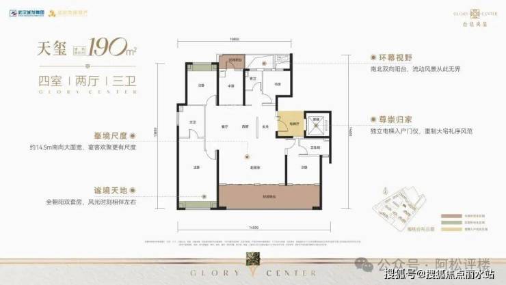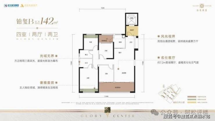 该户型为9号楼单元连接处边户,南北通透,三开间朝南。该户型带独立电梯前室,南北双阳台,共2个飘窗,而且是“类三叶草”结构。