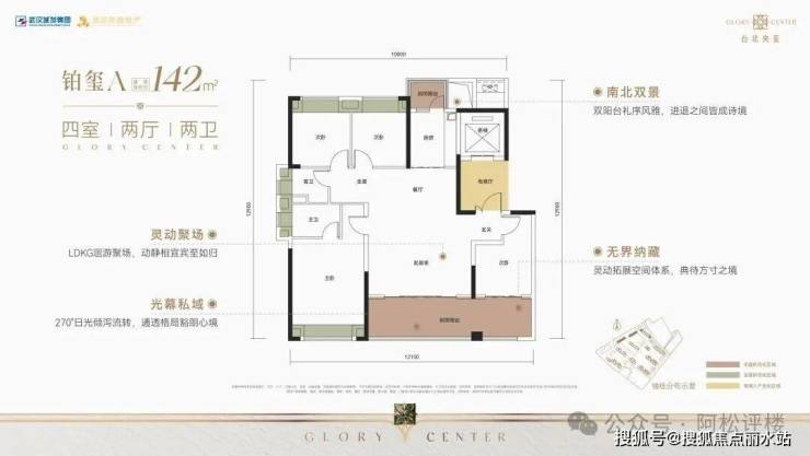 该户型为1号楼1单元单元连接处边户,南北通透,三开间朝南。该户型有独立电梯前室,南北双阳台,4个飘窗,入户体验和居住舒适度相对中间户更好。