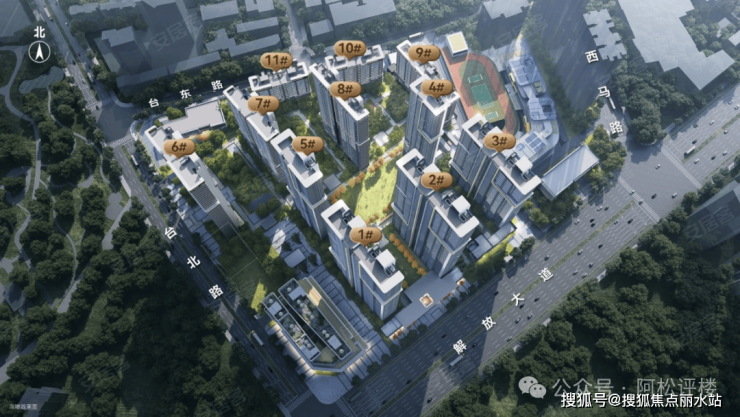 从平面图来看,该项目四面临道路,1、4、9号楼均为西南朝向,与台北路平行。