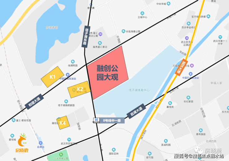 项目是融创于15年从美联手上收购的塔子湖城中村改造地块K1-K4中的K3地块,K1、K2、K4分别是融创公园壹号1、2期以及融创澜岸项目。对比这四个地块,本项目K3地块交通位置最好,紧邻地铁站。