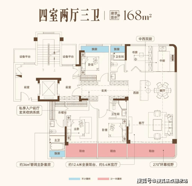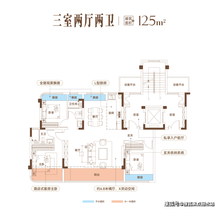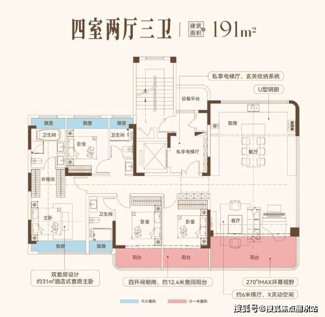 拥有私享电梯厅、玄关收纳系统,空间利用率高;U型明厨布局合理,操作便捷。约6米横厅搭配约12.4米宽阔阳台,实现270°环幕视野,朝南大面宽设计进一步提升居住舒适度。双套房主卧套房面积约31㎡,配备独立衣帽间和卫生间,私密性与尊贵感十足。
