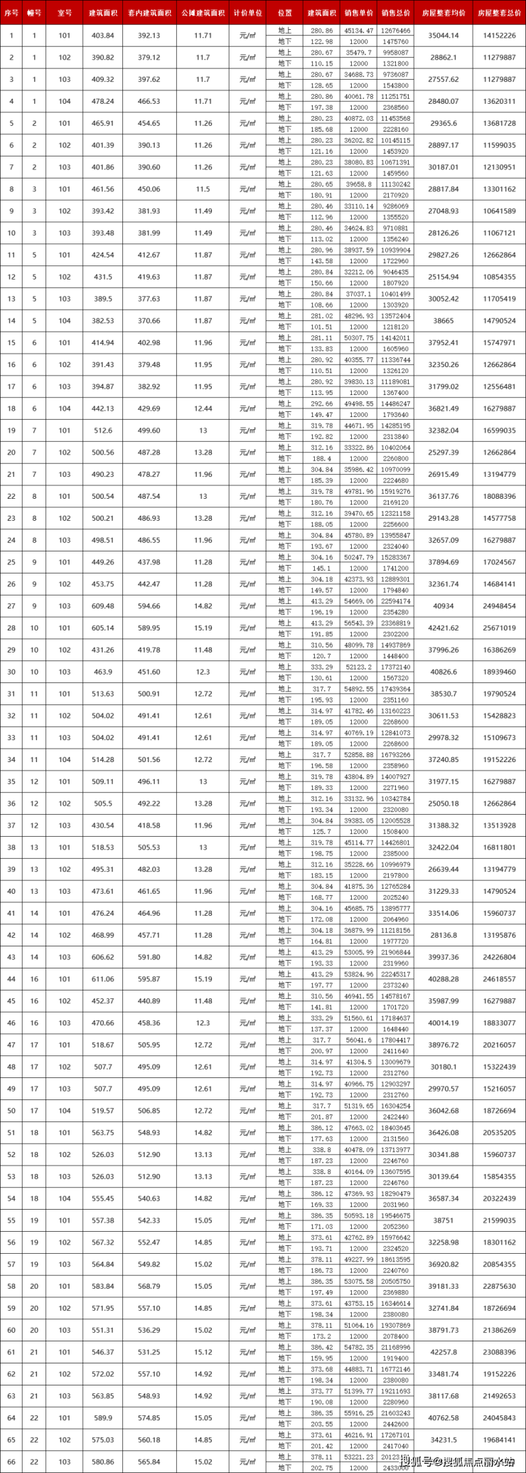 以下为项目一房一价表: