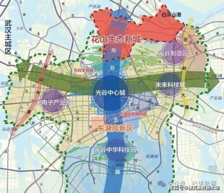 花山生态新城作为东湖高新区北端产业核心,和“黄金十字轴”生态纵轴的北门户,围绕“两带三区”发展规划,将打造成集科技创新、科技金融、总部办公功能于一体的产业聚集带。花山是占据“大光谷”战略布局的“一轴六心”重要功能中心。