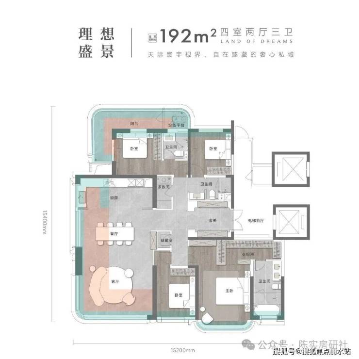 该户型位于2号楼边户。三面采光,南向约15.2米采光面,采用大量全景落地窗,LDBK一体化动区的转角弧度阳台,北向套房被阳台环绕,实现270度视野。