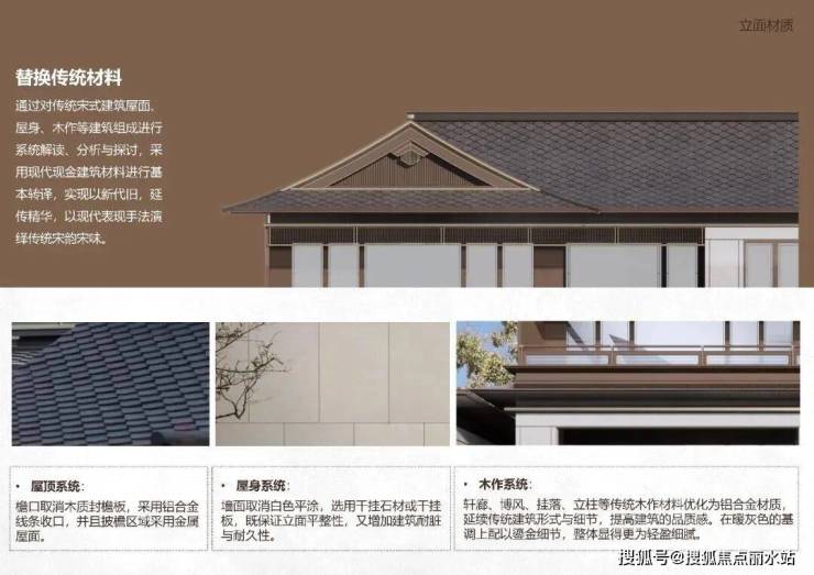 屋身系统使用干挂石材或板材,保持建筑立面平整美观,提升抗污性和使用寿命。传统木结构被铝合金替代,保留传统风格的同时提升品质感。