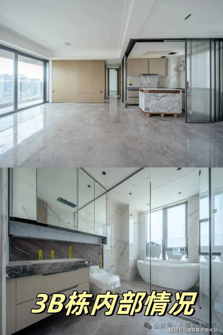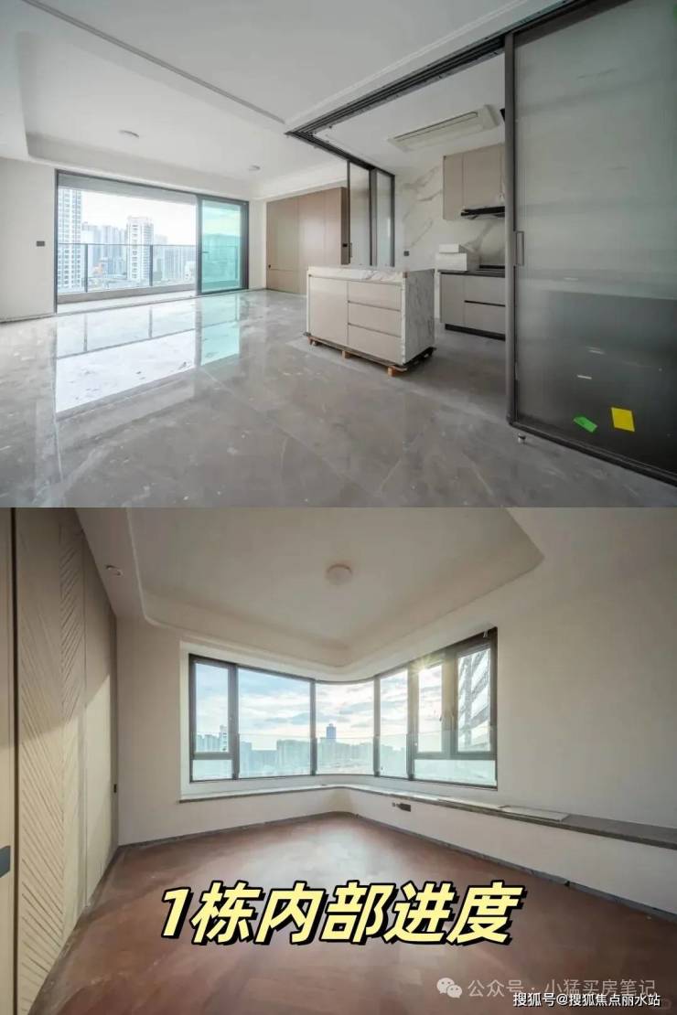 内部装修也到收尾阶段,木饰面、淋浴屏、全景推拉门等大件基本就位,插座面板、智能面板、灯具按楼栋完成 30%-95%,精装细节逐步落地。