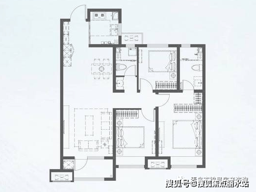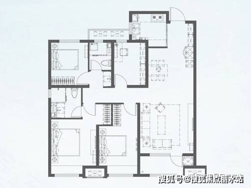119平三室两厅两卫也做了宽敞的主卧套房和餐客一体设计,双卧室朝南,客厅朝南,动静分区明确,休息区、活动区互不打扰,社交厨房,将空间利用发挥到了极致,最大程度做到空间与业主之间的精神共通。