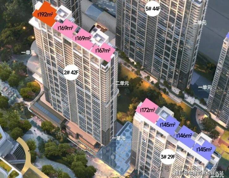 2号楼共42层,3号楼共29层,均为2个单元,2梯2户设计,包含建面约145平-192平房源。