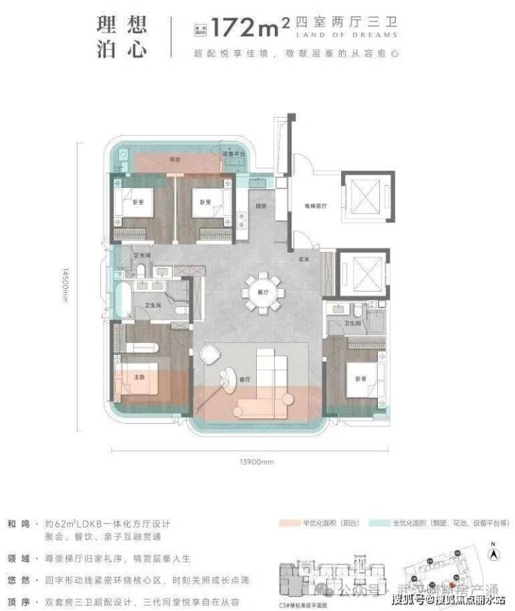约13.9米巨幕开间!约62平极致方厅!南向双主卧!