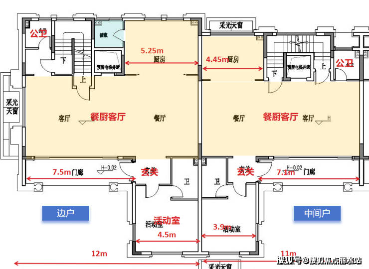 具体来看,首层主要为餐厨客厅及活动室,边户南向面宽约12米,中间户南向面宽约11米,每一户均为3层。