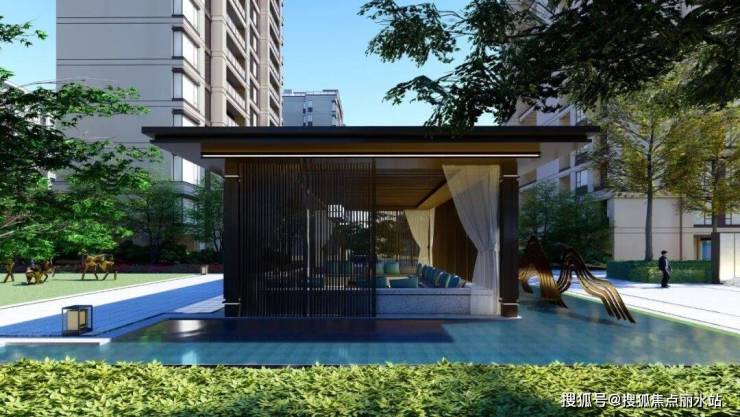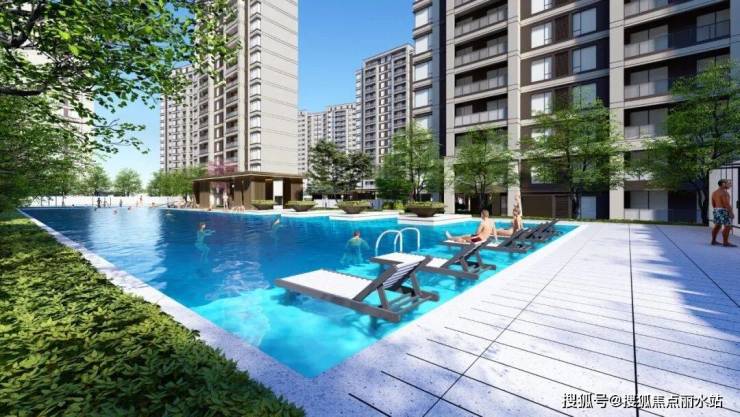 湛蓝色的波光如蓝宝石一般,镶嵌于景观中轴线上,与轴线上的水元素相呼应,从视觉上拓展了空间,与四周楼座彼此映衬。池边上绿树摇曳,树影婆娑,在周边的休闲座椅上小憩片刻,幸福感扑面而来。住在这里的人,无需远行,回家本身就是一场美好的度假。