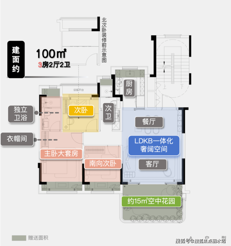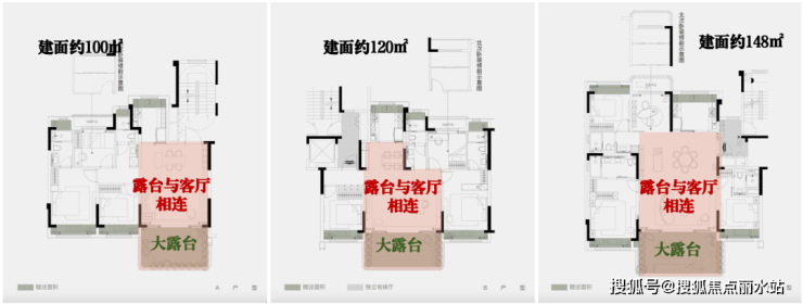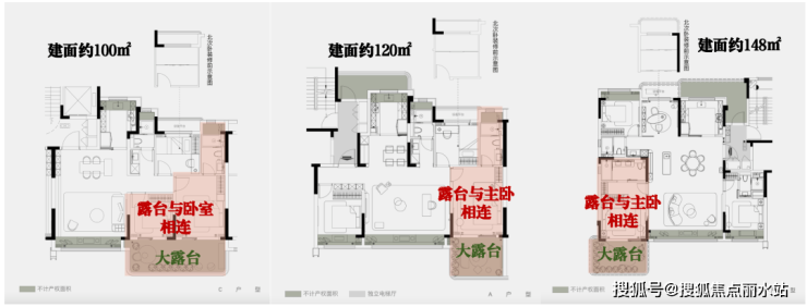 项目最小的建面约100㎡的三房户型,都有约4.9米开间宽厅设计!约15㎡露台花园,实现了小户型的"平墅化"蜕变。