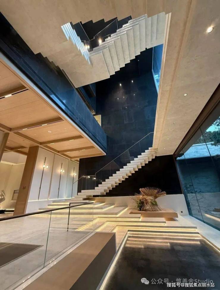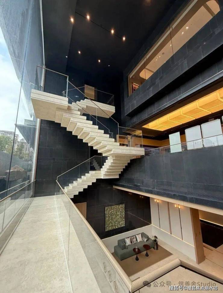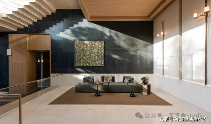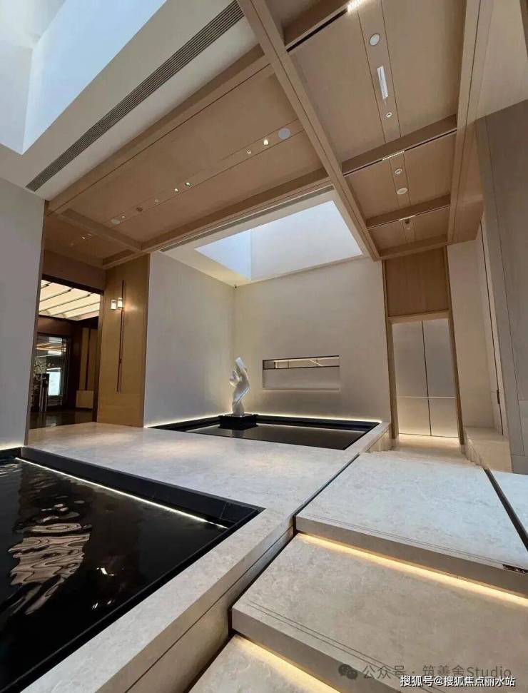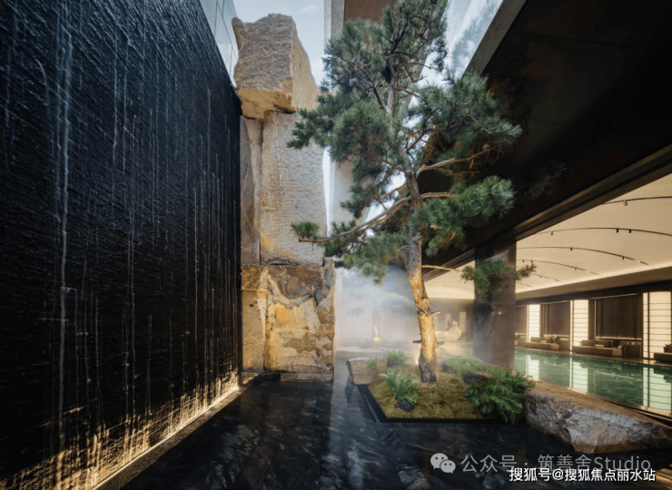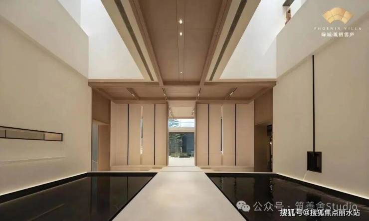 从地下一层步入归家之路,穿过地库光厅,便抵达了静谧的哲学水厅。两侧深邃的水池映衬着天光,光线透过顶部的采光井倾泻而下,伴着墙面传来的潺潺流水声,让身心瞬间沉静,归家即归心。而水厅的尽头,更藏着令人惊喜的峡谷水幕,室内与自然在此相融,构成一幅绝美的对景意境。