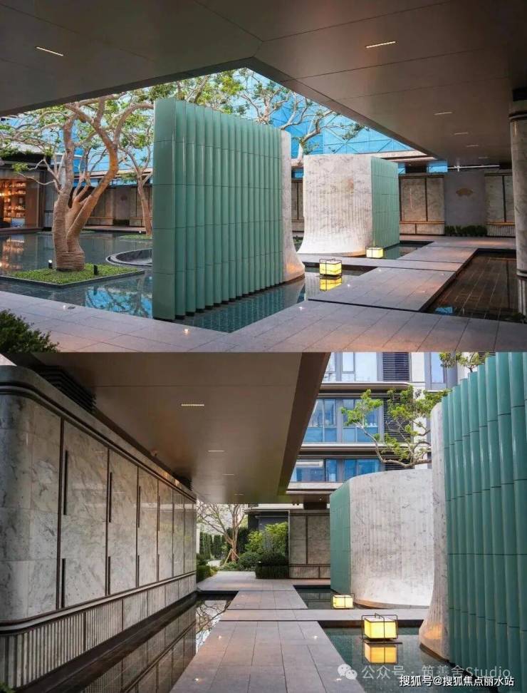 小区主入口以高奢酒店为灵感,呈现约120米的恢弘界面,精选“漫云灰”石材一体筑造,并匠心融入宁波非遗青瓷艺术。整体如一幅徐徐展开的山水手卷,为归家之路注入第一重尊崇仪式感。