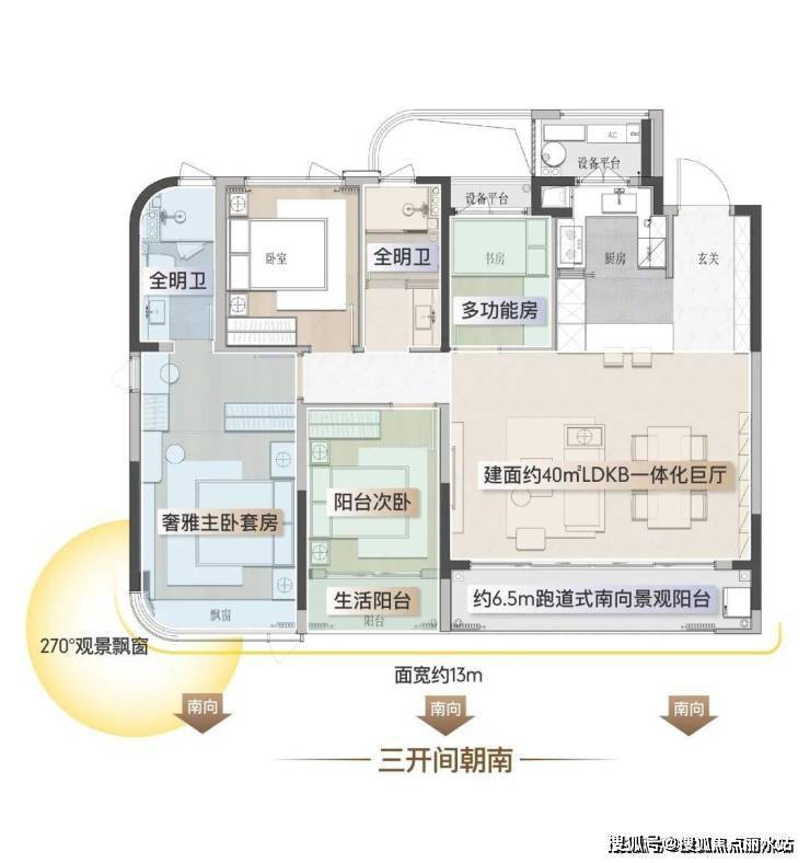 建面约115㎡经典户型,爆款上新:该户型以“三开间朝南+大尺度横厅”重构空间格局。约27㎡餐客厅与约5.8米观景阳台无缝串联,形成“社交—景观—生活”三重动线,配合约12.1米南向面宽实现“阳光平权”;约3米层高搭配弧形吊顶与全屋智能家居系统,玄关柜及部分收纳柜交付即享,北次卧可灵活改造为书房或亲子区,满足年轻家庭成长需求。