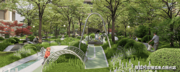 环湖麓屿组团规划了全龄化活动空间,设有林下活动区与儿童游乐区:约4000㎡绿化全林覆盖,以栾树、无患子等主景落叶乔木为主形成自然围合。季节变化的红枫与多彩花境营造优美环境,不同年龄段的居民都能在这里找到适合自己的活动空间,孩子们可以安全地奔跑玩耍,大人们也能休闲交流,真正实现了各年龄段居民的自然互动。