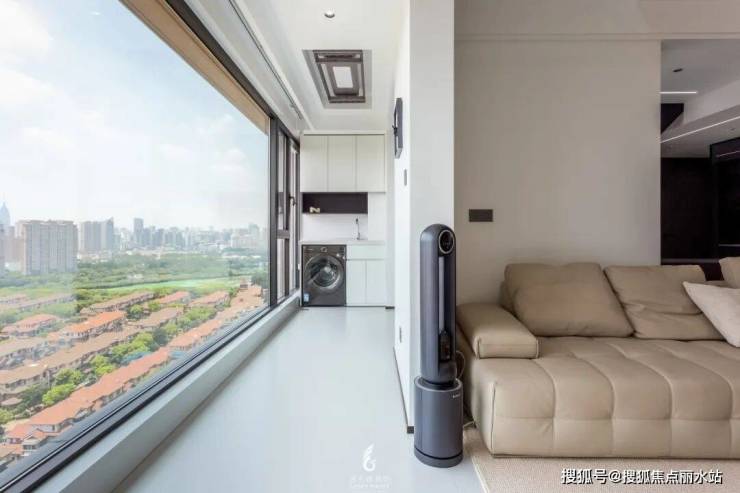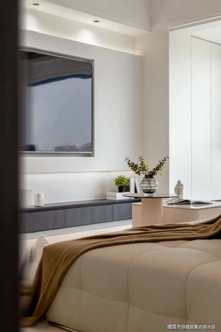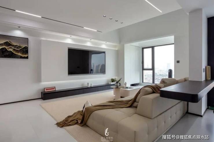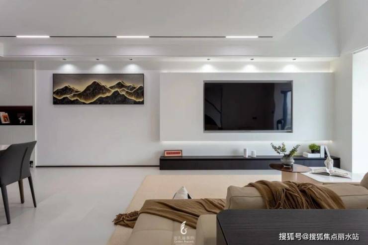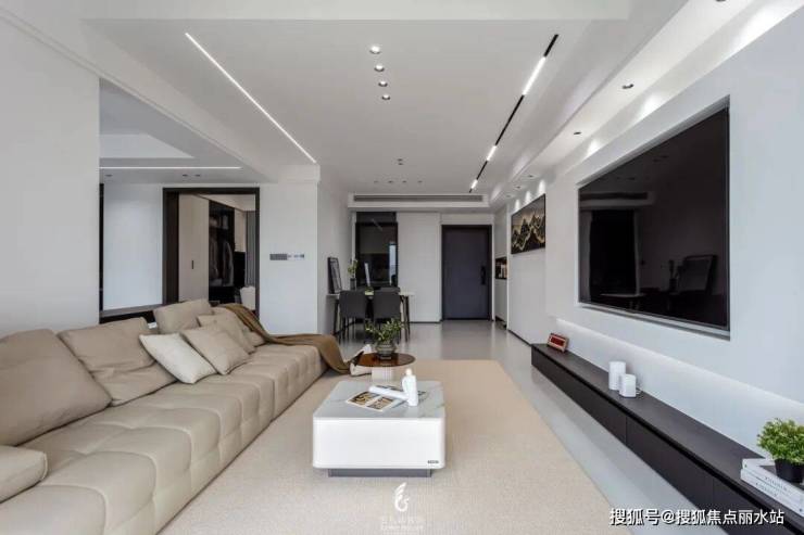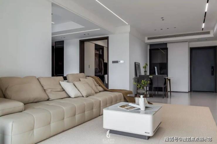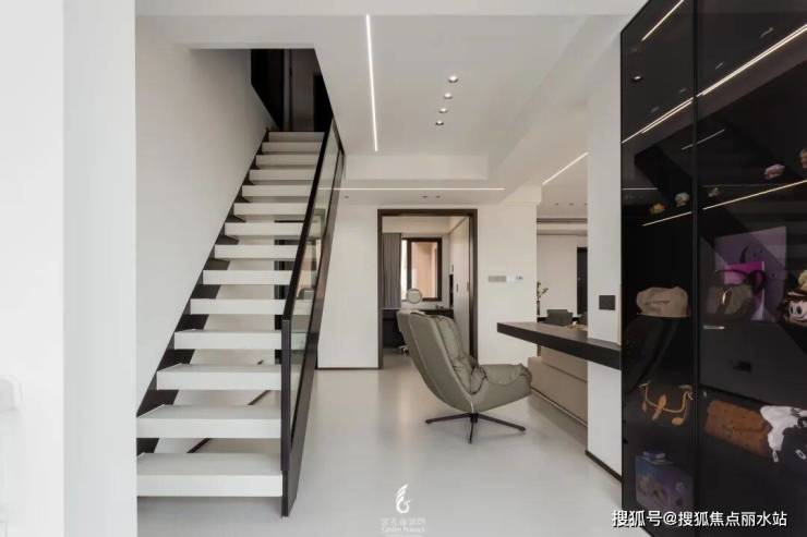 首先从空间规划来说,这个案例运用了极简主义的设计语言,如同在空白画布上勾勒秩序之美。挑高的客厅区域,光线如瀑布般倾泻而下,通过无主灯设计,线性灯与点光源交织,恰似夜空中的星轨与繁星,既满足照明又强化了空间的纵深感。