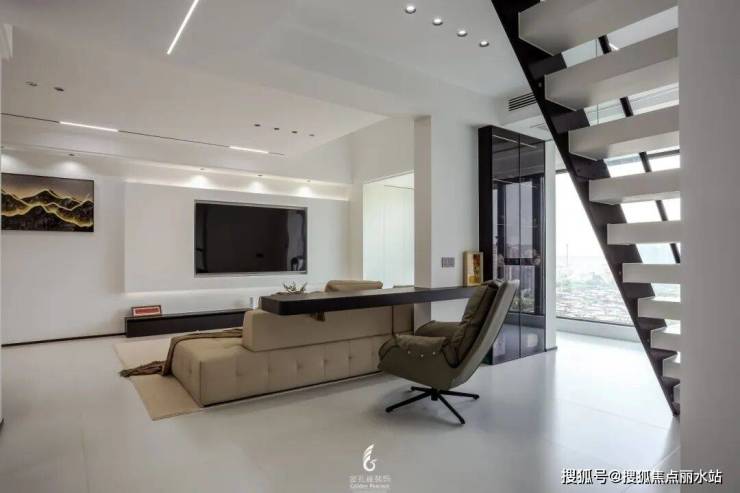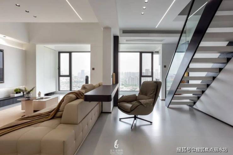 挑空区的悬浮楼梯,是“连接与独立” 的具象:上层是卧室区(私密),下层客厅(开放),黑钢扶手如 “理性的边界”,玻璃护栏又让光线穿透,暗合夫妻既需要 “并肩的默契”,也尊重 “独处的自由”;沙发旁的旋转椅,是苏郁的 “阅读角”,也是林砚的 “临时办公区”,“一个角落,两种状态”,如同家庭角色的弹性切换。