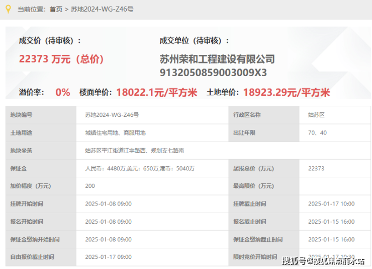 云栖海棠里,即,苏地2024-WG-Z46号地块,位于姑苏区平江街道江宇路西、规划支七路南,是1月17日,苏州荣和工程建设有限公司以底价22373万元竞得,成交楼面价18022元/平。