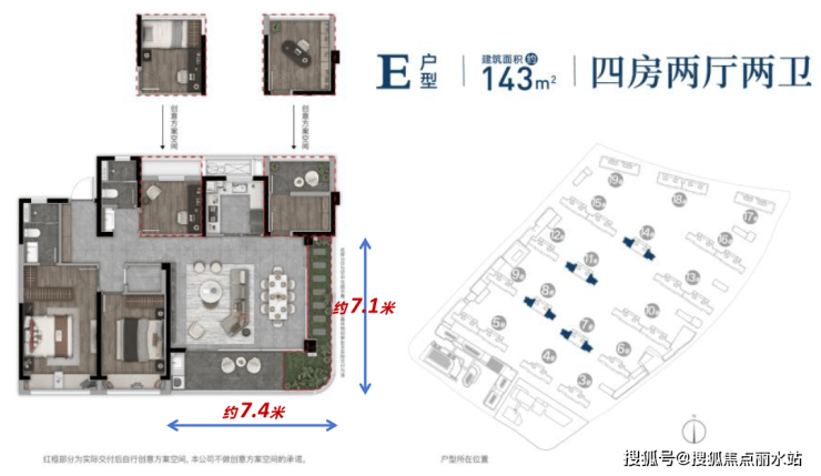 边厅143户型,4房2厅2卫,约14米开间,约30㎡双厅,外连跑道式环幕阳台,约270°的观景视野,可以俯瞰一线河景。赠送北向阳台,可DIY成瑜伽室、阳光房、衣帽间等;主卧套房约28㎡的尺度,更具私密性。