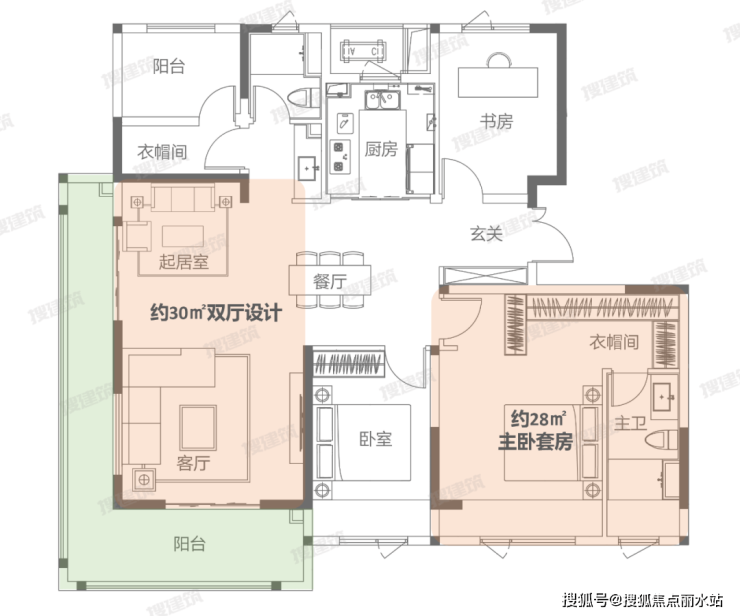 南向双卧设计,主卧套房步入式衣帽间,纯南卫生间。