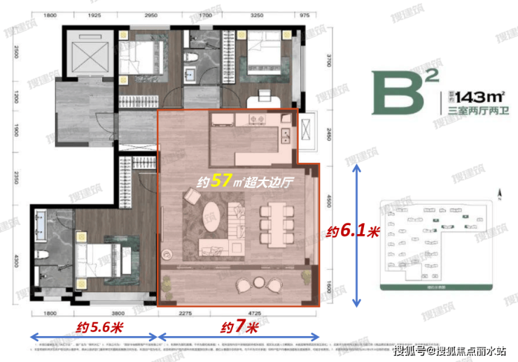 西安保利·天汇主力户型143㎡3房2厅2卫,采用豪宅的配置边厅设计,边厅面积高达约57㎡,实现了LDKG一体化设计,以及270°转角采光,双面瞰景,将景观尽可能的纳入室内。