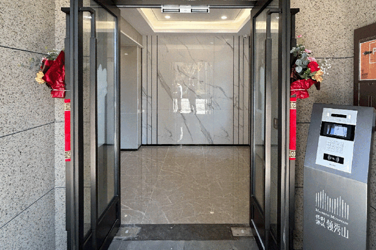 针对入户单元门,以“礼序”“智造”为突破口,提升用料材质:将大堂单元门由原来的钢质门提升为不锈钢门,采用镀钛拉丝材质边框并配以整面通透白玻,大堂设置大规格岩板背景墙,再次从感官上进行品质拉升。