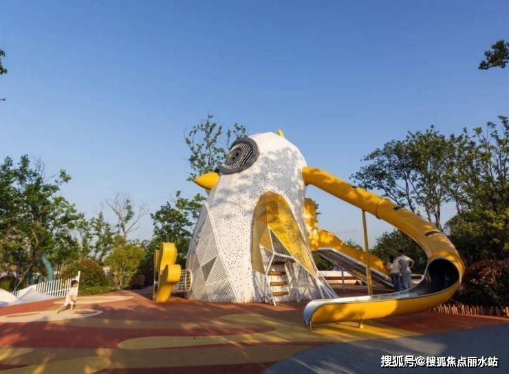 夕阳西下,忙碌了一天的父母带着孩子来到这里。当孩子沉浸在精灵鸟洞洞滑梯的快乐中,可以和爱人牵手坐在长椅,看霞光铺满天际。