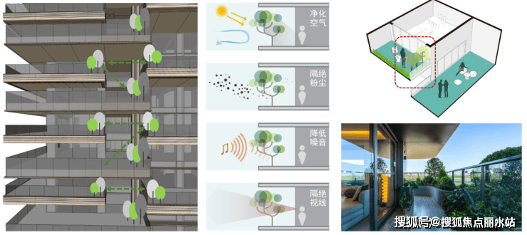 当然,部分空中庭院的隐私性问题,江万则通过栽种绿植加以主动视线隔绝,如下图所示。