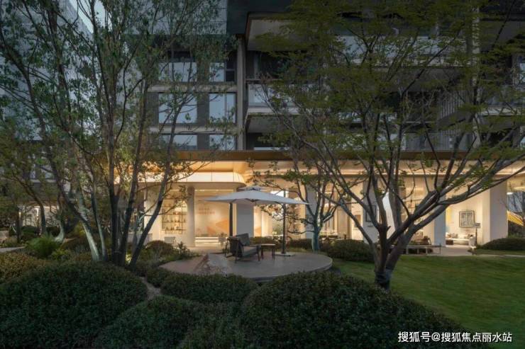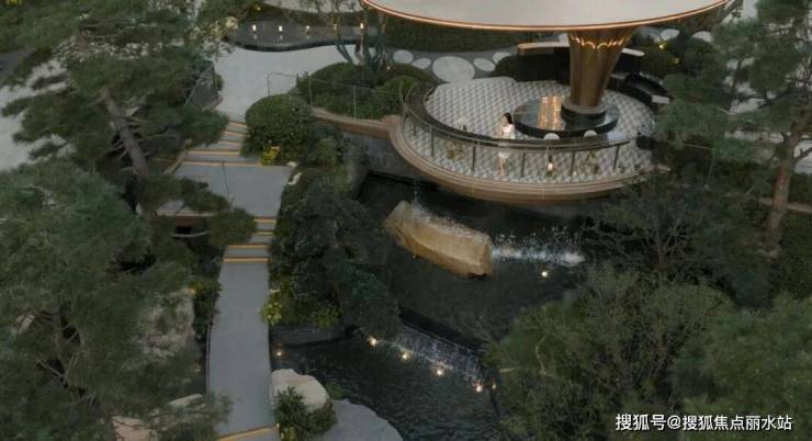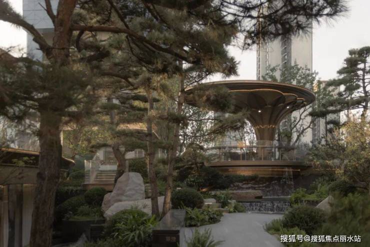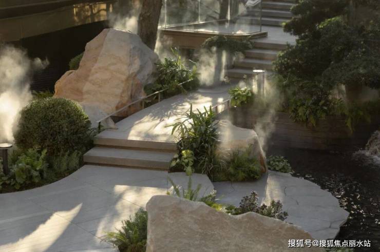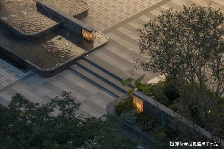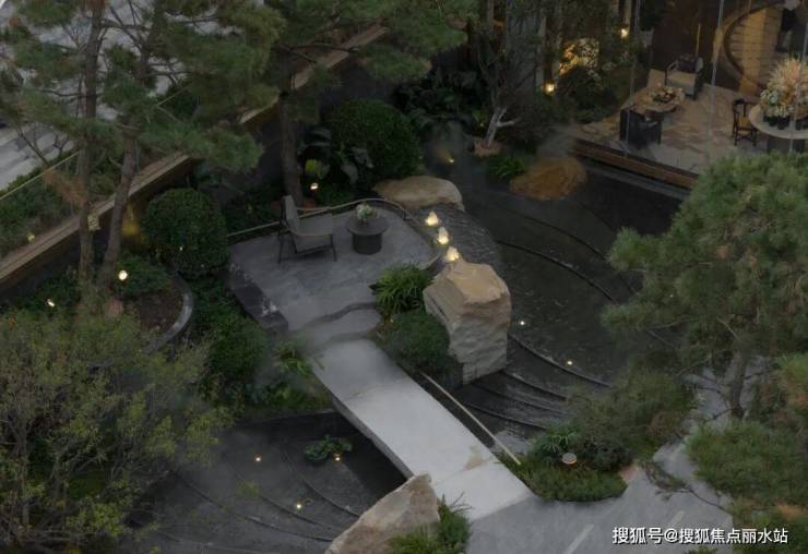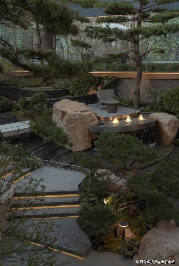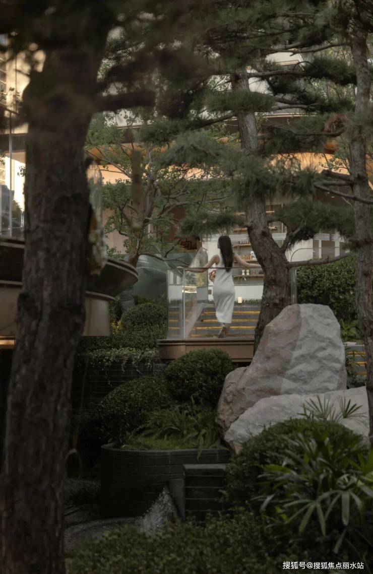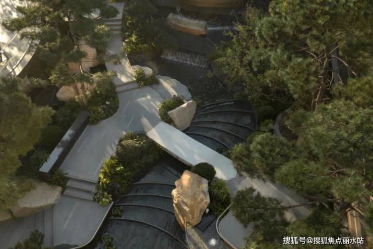 拾阶探幽,松枝垂探,俯仰叠水层阶。引山为屏,活水为脉,方寸间气象万千。几何光影映照中庭,古意今韵,共构沉浸新境。