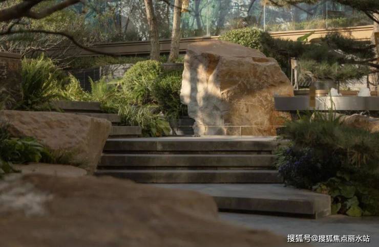 园中有径,一方华木之庭映入眼帘,台阶采用花岗岩铺地,两侧种植特选造型松,既是造景,也是意境,感知天地之美,尽在方寸。