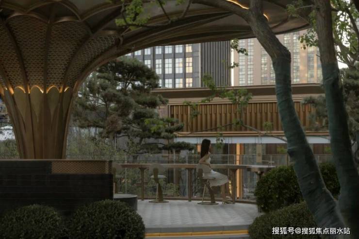 架空层向自然延伸,化身为一处雅致的咖啡吧。林下平台与架空层咖啡吧浑然一体,形成流畅的过渡。羽毛枫摇曳生姿,静石卧水,灵动点睛。景观空间与架空层功能相互渗透,延展场所温度,打造情景交织的“新生花园”复合空间。