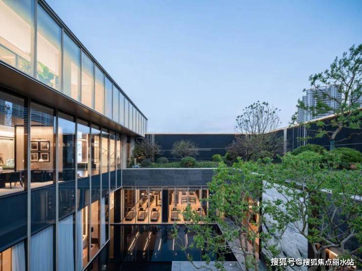 下沉庭院设计了⼤⾯积景观⽔⾯,寓意「引江⼊园」,并以纯粹⼲净的玻璃幕墙与爱尔兰绿奢⽯墙对景,营造出静谧、沉稳、祥和与空灵的氛围,希冀抚平闹市的喧嚣,实现「出则繁华、⼊则静谧」的生活场景。