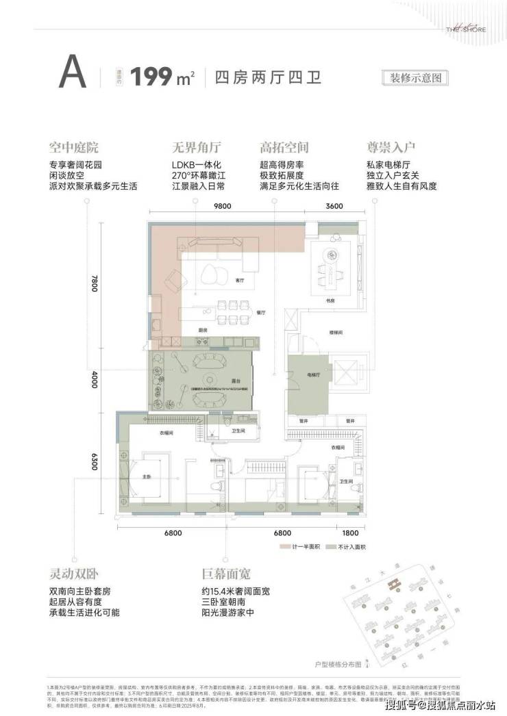 一线看江大平层,新四代头排瞰江环幕三景舱,至高约116%四代负公摊、私梯入户专属前厅、超大空中庭园、约70㎡无柱环厅、270°环幕观江、约15.4米极致面宽。