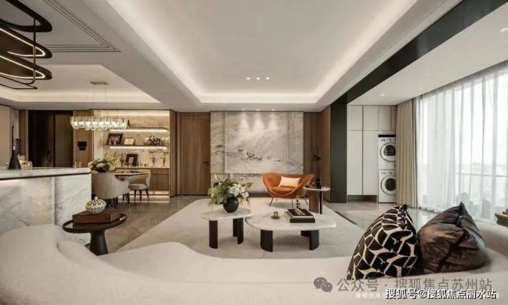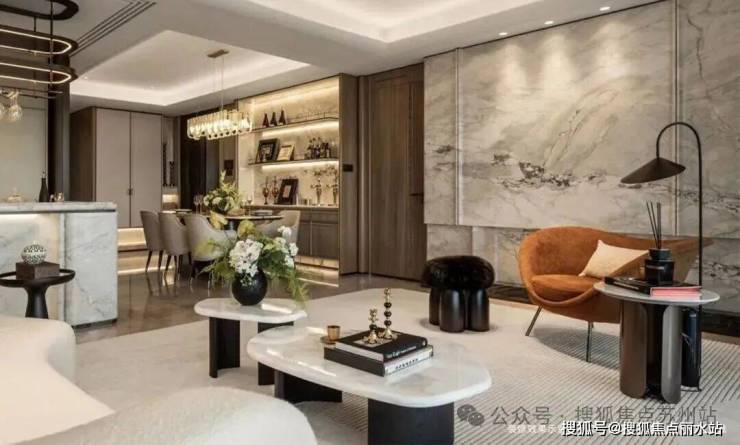 室内大量运用奢石,搭配统一木饰面与皮革材质,通过圆弧设计、隐形出风口、无高差客厨地面等“隐形美学”处理,让奢华与舒适完美融合。