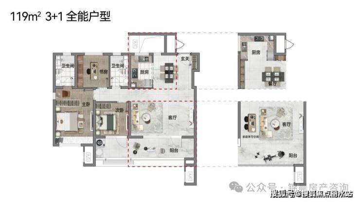 119平户型,在青岛120平以下面积段的高层产品中,首次置入与主流需求适配的横厅设计,面宽5.4米,把别家的基础款做出了大宅感。这个横厅不是功能受限的餐客融合版,而是与餐厅彼此独立,功能纯正的真横厅。业主还也可以根据需求,将横厅设置成半开放式书房,具备3+1的可变属性,为生活内容的合理调整预留空间伏笔。