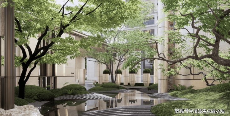其中,涛影流金·下沉式庭院,撷取黄河第一湾之“形”,一座石桥静卧清波之上,叠瀑循阶而下,流水淙淙,庭中每株乌桕独立成景,让业主收获归家如入园的感受。