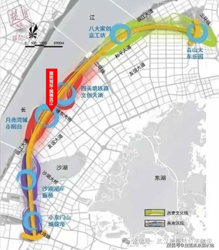 🏞【武昌生态文化长廊】总长度13.46公里,共分为两期建设,一期工程已建成投入运营;该项目共分为三个区段,本案所在区域为武昌滨江人文体验段,包含四美塘铁路文创天地、月亮湾城市阳台等亮点。