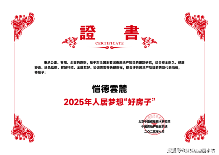 当行业聚焦“好房子”新标准,恺德集团以现象级红盘【恺德雲麓】交出革新答卷!2025年7月,在杭州由北京中指信息技术研究院主办的“中国房地产大数据系列报告会暨2025上半年市场总结及下半年趋势预判”会议上,恺德雲麓项目凭借“真四代”产品力,革新城市人居封面,喜获2025 年人居梦想“好房子”荣誉!