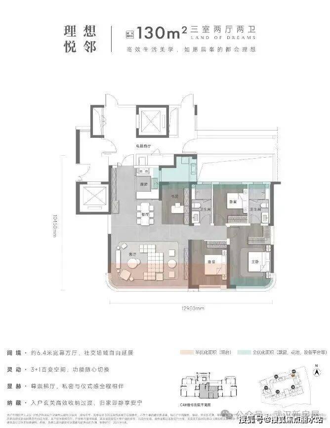 4#总高38层,一个单元,三梯三户,中间户130㎡,两个边户145㎡;