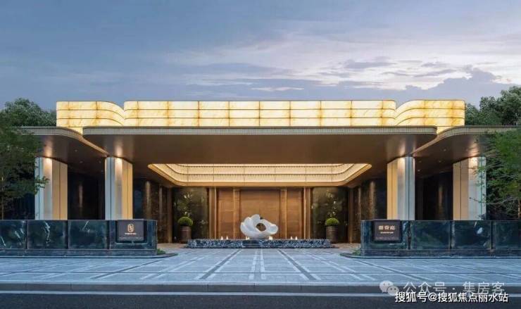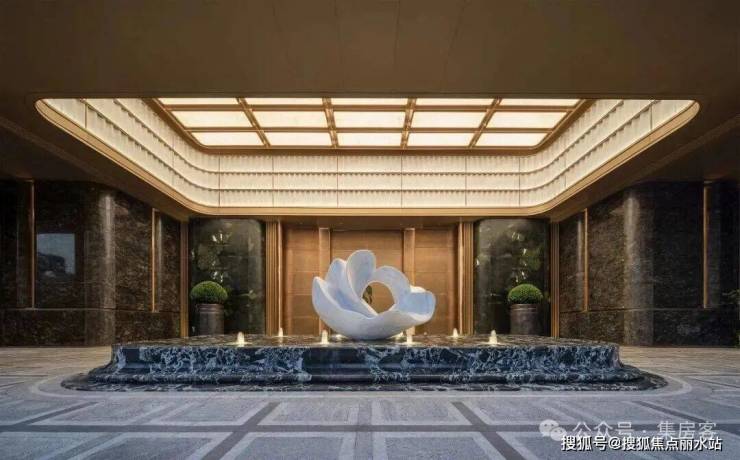 如山茶花般的定制石雕,映衬厚重的朱氏铜门,配上两侧大面荷塘月色奢石、铂金钻石材景墙,远远望去,宛如歌剧开幕时垂坠的天鹅绒帷幔,打开归家的仪式感。