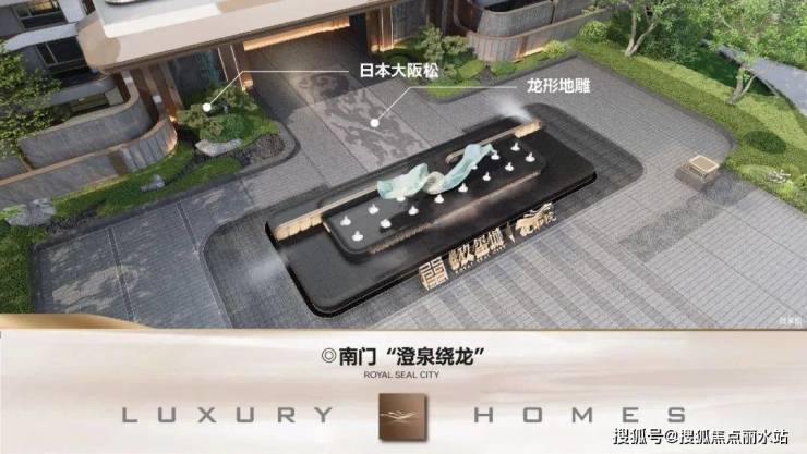 南门入口处,高定银丰玖玺城珑和院标识与"珑腾飞翔"的艺术雕塑呼应。不惜巨资打造的琉璃龙角造型,演绎出神龙昂首的恢弘气势。日本大阪松、约66㎡的龙形石雕、福鼎黑石祥云地雕与御道宫灯配合,将600年紫禁城的威仪,凝聚于世界CEO与家人归来的大门口。
