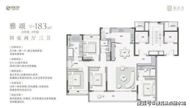 绿城·沁百合规划建设10幢9-11F低密纯洋房,打造了建面约155/167/183/230㎡四大户型,总房源量不到300套。