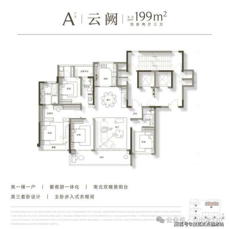 即将首开的建面约199㎡A户型,做到了类一梯一户设计,可实现“电梯厅玄关化”,私密感满分。