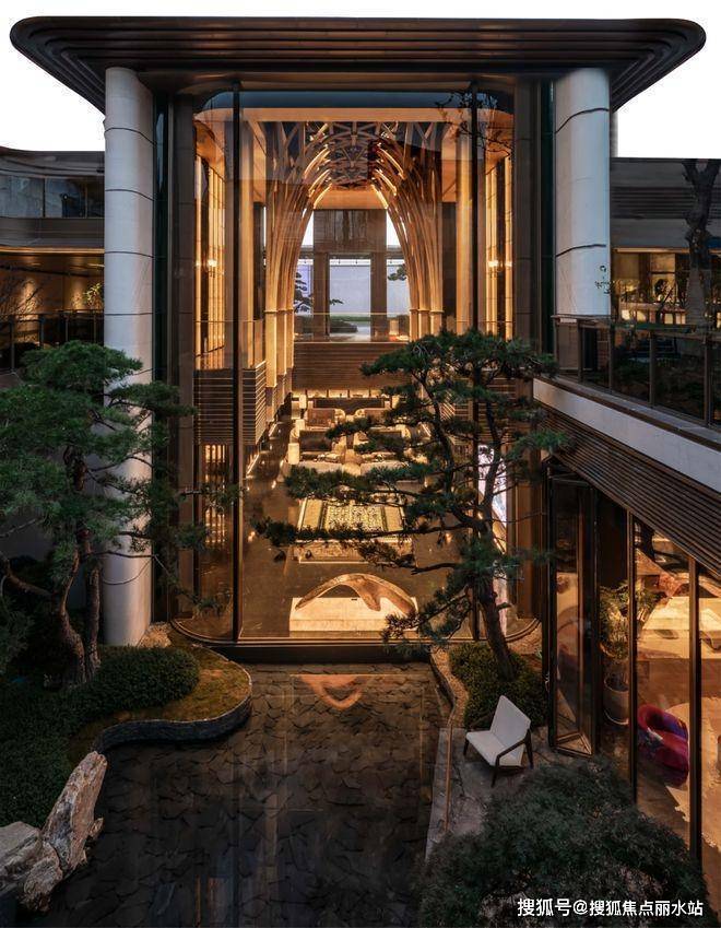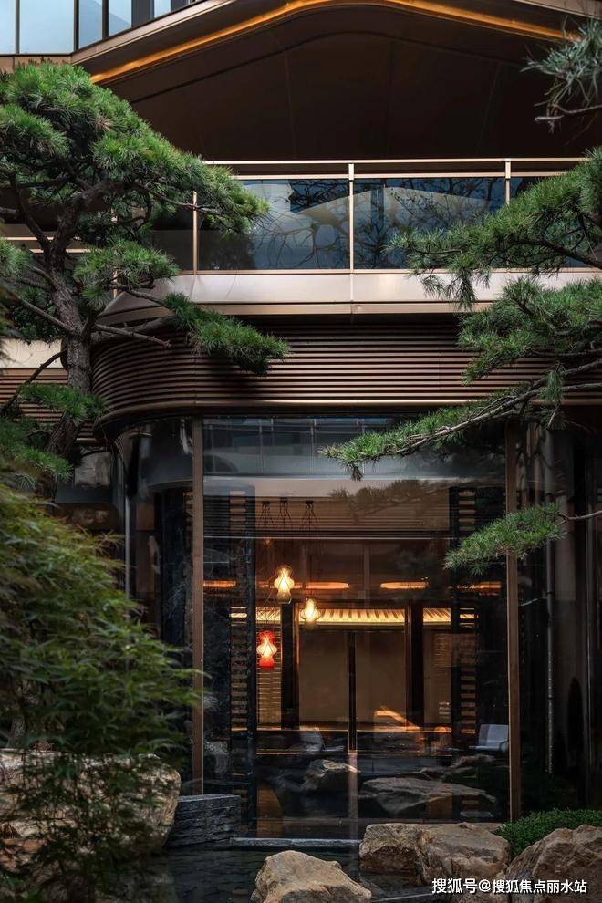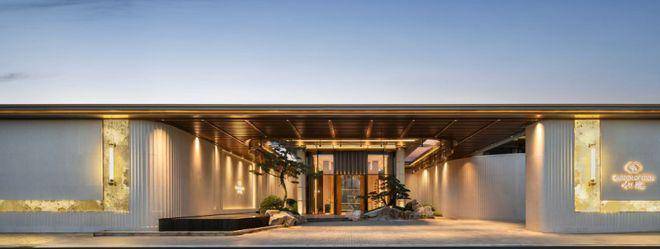 景观以「四境四巷」铺陈东方礼序,「五重归家」轴线串联宽约128米恢弘门庭、约15米叠石飞瀑、约13米榫卯转译的现代穹顶等。