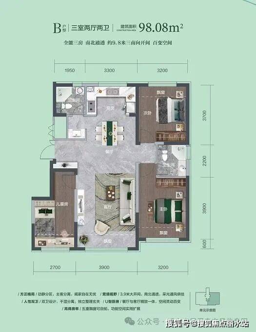 89m2国标通透两居;99~126m2全能三居,飞机户型,89m2国标通透两居;99~127m2全能三居,三开间朝南,大三阳户型;U型明厨、 独立收纳玄关;人性双卫,干湿分离,从此不再抢卫生间。