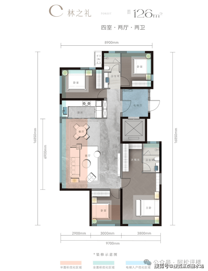 总的来看,建面约126平户型是当前市场上非常少见的,兼具功能性、舒适性、私密性与空间感的超绝设计。