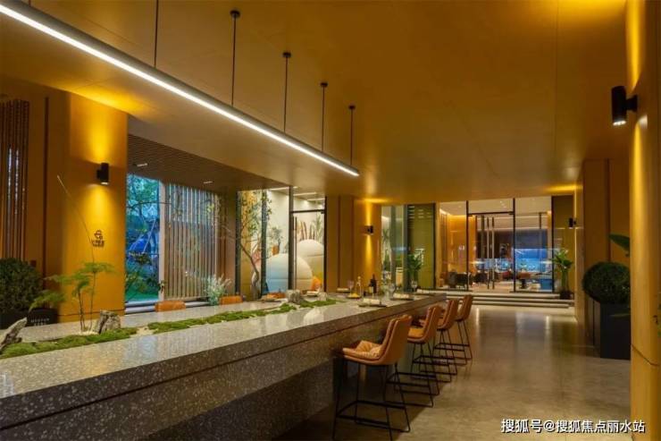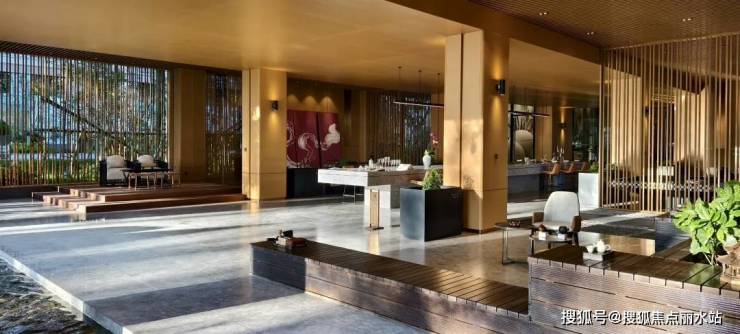 从入户大堂泛会所延伸出来的“灰空间”,光线和水流交错,过渡自然。