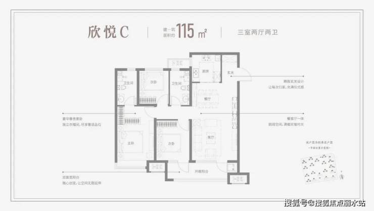 115平套三,敞开式双阳台,南向三开间瞰景;北向卧室可作为书房,亦可观景。