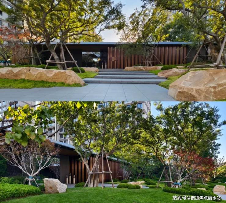 优秀的景观离不开“在地性”,更离不开建筑协调性,在此基础上铺设树木、置石、水系和结构元素。